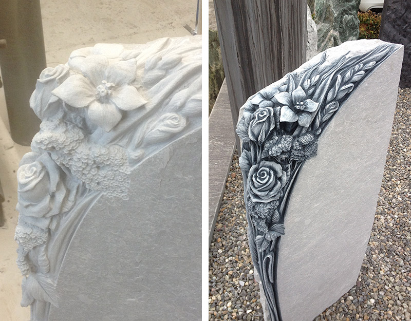 Motiv: Die Blumenranke wurde teilplastisch gehauen, patiniert und imprägniert.